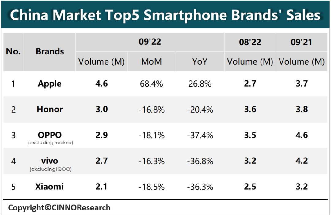 具体来看,9月苹果(AAPL.US)以约460万部的销量重回国内市场第一,同比增长26.8%,环比增长68.4%,环比、同比双增长,Top5品牌同比和环比唯一正增长,主要得益于苹果新品iPhone 14系列上市以及iPhone 13持续良好的市场表现。