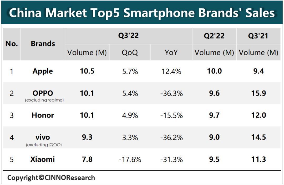 手机品呈现的明显分化趋势。随着苹果iPhone 14系列的发布与出货,苹果手机的销量持续上升,同比与环比双双增长。与Top 5中其余安卓品牌情况相比,苹果呈现一枝独秀的市场表现。