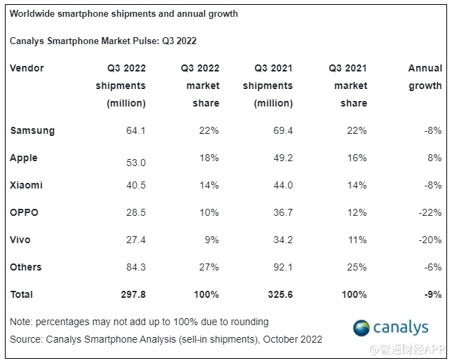 智通财经APP获悉,根据研究机构Canalys和Counterpoint的数据,今年第三季度全球智能手机出货量同比下降9%,而苹果(AAPL.US)是全球五大智能手机供应商中唯一实现增长的公司。