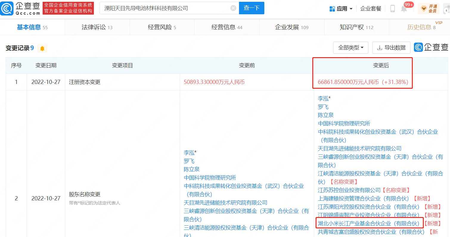 智通财经APP获悉,企查查APP显示,近日,溧阳天目先导电池材料科技有限公司(下称:天目先导)发生工商变更,新增湖北小米长江产业基金合伙企业(有限合伙)等多名股东,同时公司注册资本由5.09亿元人民币增加至6.69亿元人民币,增幅31.38%。
