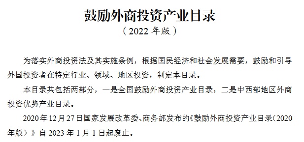 《鼓励外商投资产业目录(2022年版)》已经2022年7月29日国家发展和改革委员会第22次委务会议审议通过和商务部审签,并经国务院同意,现予以发布,自2023年1月1日起施行。