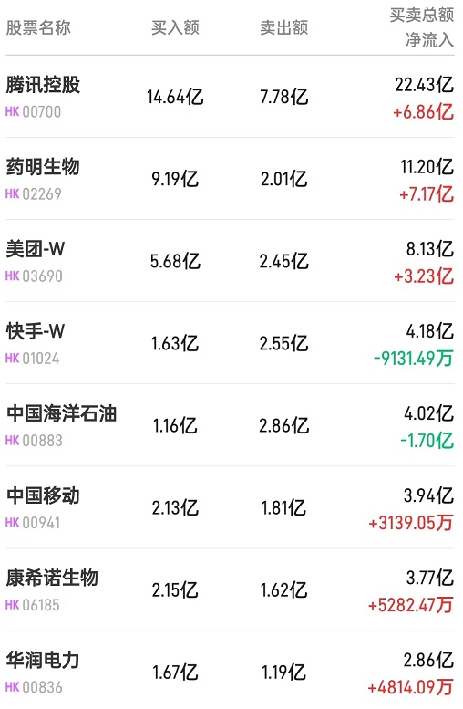 此外,中国移动(00941)、中芯国际(00981)分别获净买入3139万、1049万港元。而中海油(00883)、中国神华(01088)、李宁(02331)分别遭净卖出1.7亿、8065万、4406万港元。