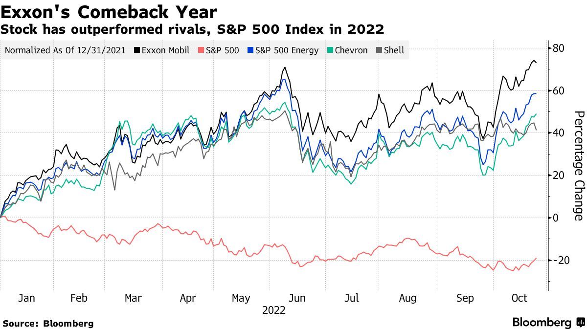 今年以来,在强劲业绩以及股息率、回购规模的大力推动下,埃克森美孚股价远超其同行,以及美股大盘——标普500指数。