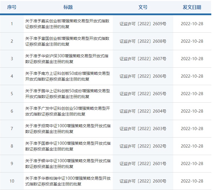 智通财经APP获悉,10月28日,据中国证监会官网显示,易方达、博时基金、招商基金等13家公募上报的第二批增强型ETF获批复。据悉,13只增强型ETF从上报到拿到证监会批文仅5个工作日,批复时间极短。