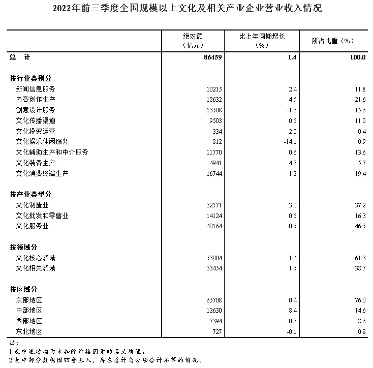 据对全国6.8万家规模以上文化及相关产业企业(以下简称“文化企业”)调查,2022年前三季度,文化企业实现营业收入86459 亿元,按可比口径计算(详见附注2),比上年同期增长1.4%[1],增速比上半年加快1.1个百分点。