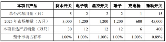 招股书披露,根据募投项目所生产的产品在单台汽车的用量,再结合2025年汽车及新能源汽车的销量预测情况,可得出如下市场容量: