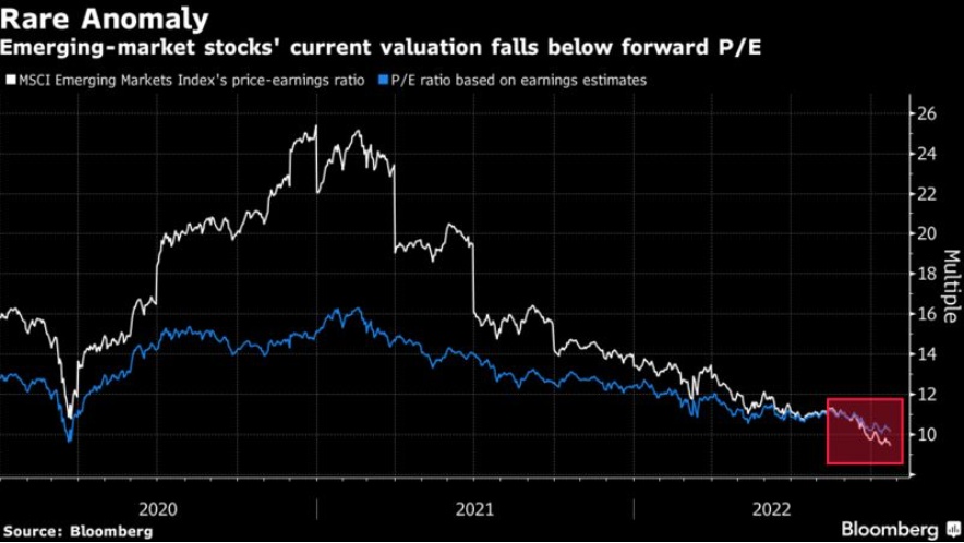 Gemcorp Capital首席经济学家Simon Quijano-Evans表示:“市场正处于一个拐点,市盈率下降的如此之快反映了投资者对经济衰退的担忧日益加剧。”他补充道。“粗略地说,要让新兴市场市盈率预期再次上调,我们需要看到美联储的持续走鹰态度趋于缓和,美元汇率趋于平静。”