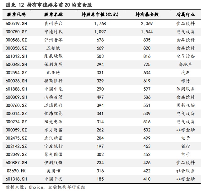 具体到个股,相较二季度,药明康德(603259.SH)、华友钴业(603799.SH)、爱尔眼科(300015.SZ)、晶澳科技(002459.SZ)、天齐锂业(002466.SZ)和腾讯控股(00700)退出前20大重仓股行列,而招商银行(600036.SH)、阳光电源(300274.SZ)、宁波银行(002142.SZ)、紫光国微(002049.SZ)、伊利股份(600887.SH)、中国平安(601318.SH)新进入前20大重仓股行列。三季度末,主动权益类基金的第一大重仓股是贵州茅台(600519.SH)。
