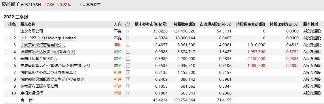 此外,陈鹏扬管理的博时成长优势混合、博时裕隆灵活配置混合新进前十大流通股东。值得一提的是,良品铺子未在上市两只基金中报中出现,这意味着,陈鹏扬在三季度合计买进良品铺子203.96万股,期末参考市值合计达0.55亿元。