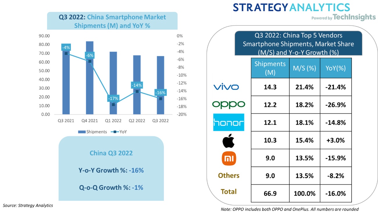 Strategy Analytics高级分析师吴怡雯表示:“2022年Q3,中国智能手机出货量下降至6690万部,同比下降16.0%。这是智能手机出货量连续第六个季度出现年度下滑。库存调整等因素导致需求减弱加重了喜忧参半的业绩。”
