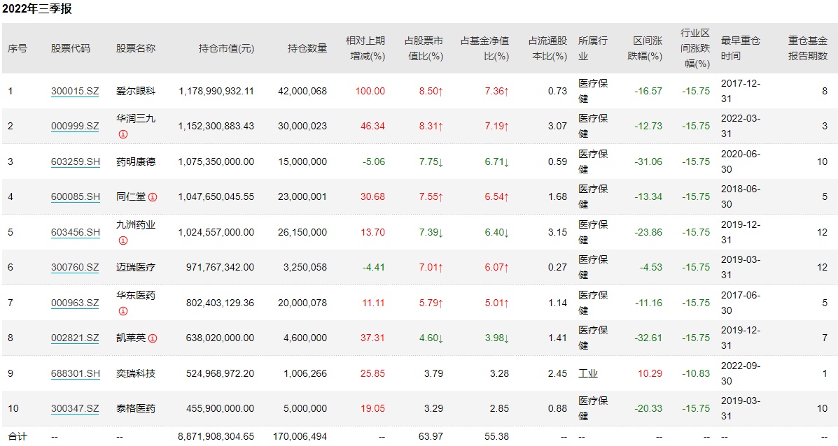 值得注意的是,三季度,赵蓓大幅增持了爱尔眼科,持股数环比二季度末增加达100%。华润三九也获得大幅度增持,持股数环比二季度末增加46.34%,同仁堂、凯莱英的增持幅度均超30%。