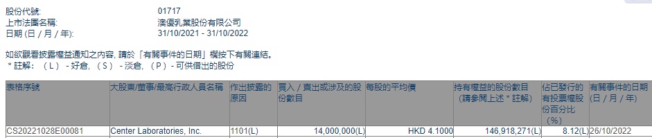 智通财经APP获悉,香港联交所最新资料显示,10月26日,Center Laboratories, Inc.增持澳优(01717)1400万股,每股作价4.10港元,总金额为5740万港元。增持后最新持股数目约为1.47亿股,最新持股比例为8.12%。