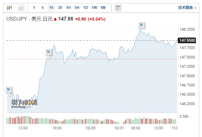 最近一次的干预导致美元兑日元立即下跌超过7个点,但此后日元再次走低。由于美国的消费者支出数据依旧强劲,市场重点关注通胀并放弃了美联储放缓加息速度的预期,美元周一再次上涨。截至发稿,美元兑日元上涨0.34%,报147.95。