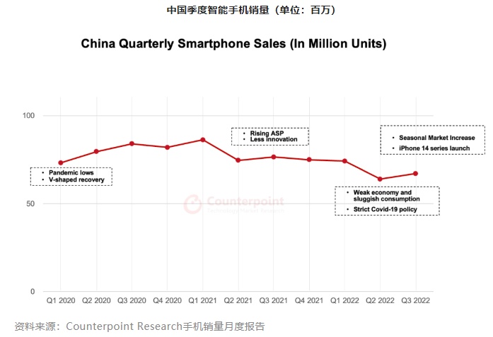 智通财经APP获悉,10月31日,根据Counterpoint的手机销量月度报告,随着中国的经济增长和消费持续低迷,2022年第三季度中国的智能手机销量同比下降12.4%。然而,市场出现了4.9%的环比增长,这是因为该季度市场从上一季度受新冠带来的主要城市管控的影响中逐步恢复了过来。同时,市场对iPhone 14 Pro和Pro Max机型的强劲需求也对本季度整体市场起到了提振的作用。