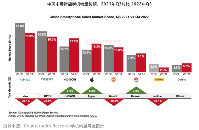 研究分析师Mengmeng Zhang在评论竞争格局时说:"2022年第三季度,vivo、OPPO和HONOR仍然是中国前三大智能手机OEM。但vivo和OPPO的销售额同比下降了20%以上,而HONOR同比增长了2.5%。vivo和OPPO的下降可能是由于中国智能手机市场的暴跌以及HONOR的快速回归。华为的表现也很好,同比增长4.8%。尽管缺乏5G支持,但其Nova 10系列和Enjoy 50在消费者中很受欢迎。"