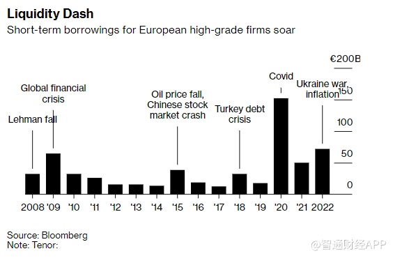 智通财经APP获悉,欧洲企业正在寻求新的短期流动性渠道,这与2020年疫情最糟糕的时期类似。据悉,欧洲的高评级公司正在采用两年或更短期限的贷款工具,这明显短于常规贷款的平均五年期限。数据显示,这些公司今年已经敲定了760亿欧元(760亿美元)的短期融资,仅次于2020年的1530亿欧元融资。