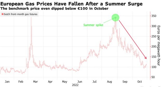 今年夏天,当向存放天然气库存的废弃盐洞、含水层和燃料仓库注气时,燃料价格一度达到每兆瓦时340欧元左右的峰值。如今,冬季基准天然气合约的交易价格不到当时的一半,接近140欧元。