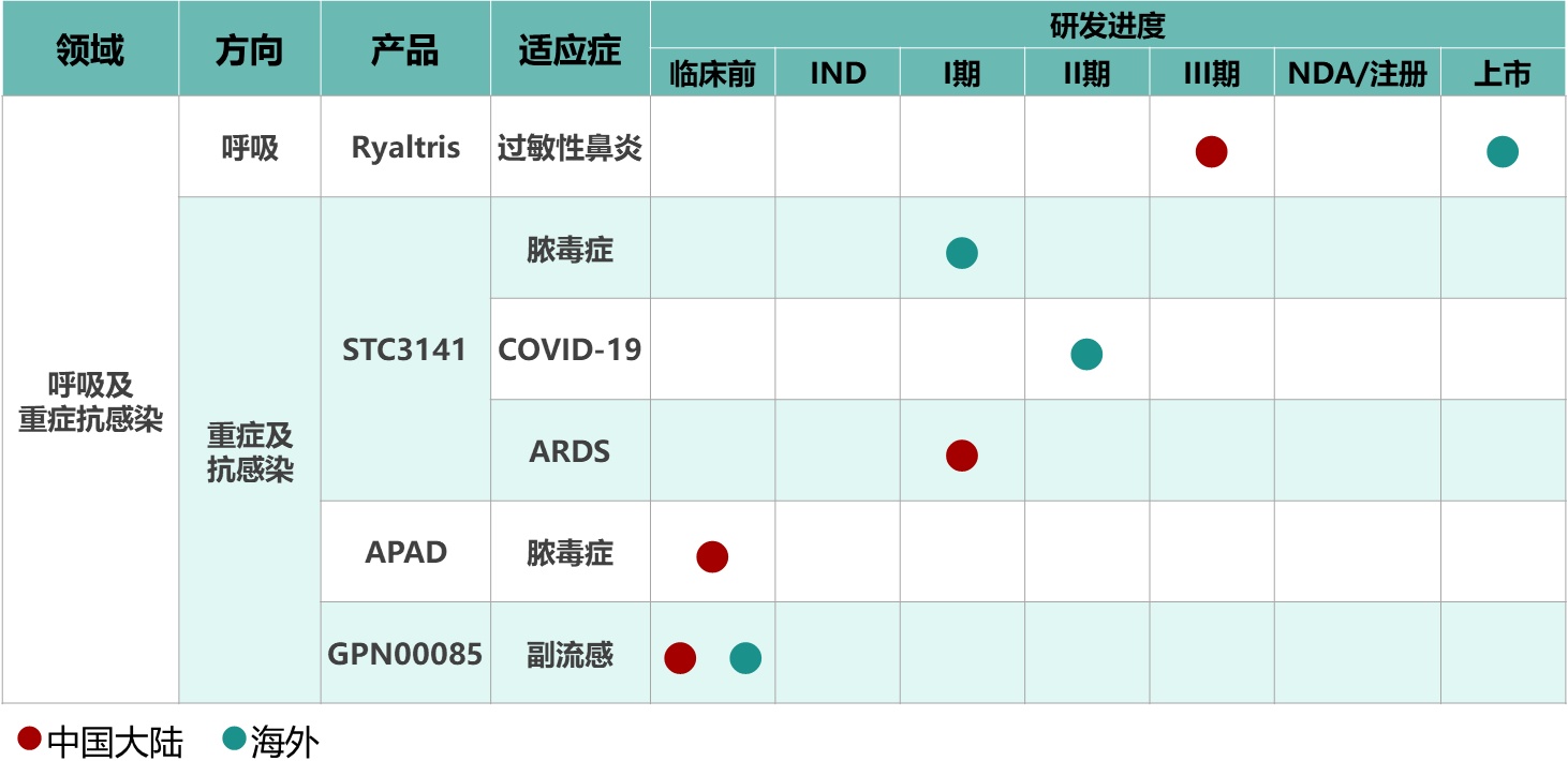 创新产品方面,远大医药在该板块针对过敏性鼻炎、脓毒症、ARDS、新冠肺炎以及副流感等未被满足临床需求的适应症进行了前瞻性布局,目前已储备四款全球创新药物,其中用于治疗季节性过敏性鼻炎的新型复方鼻喷剂Ryaltris已进入注册性临床阶段,其中国III期临床研究已与今年4月完成首例患者入组;用于脓毒症等重症的全球创新药物STC3141已在五个国家获得七个临床批件,国际全球多中心临床顺利推进中;另一款可与STC3141协同治疗脓毒症等重症的全球创新药APAD以及全球首创副流感新药目前均已完成化合物筛选,进入临床前研究阶段。