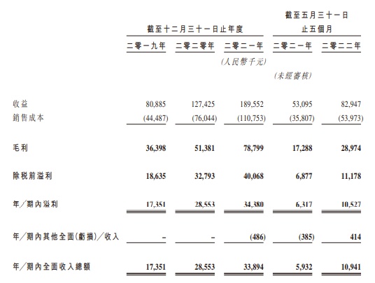 财务方面,于往绩记录期间,Howkingtech不断改善财务表现。公司收益由2019 年的人民币8088.5万元增加至2021年的人民币1.9亿元,复合年增长率为53.1%。公司收益由截至2021年5月31日止五个月的人民币5309.5万元进一步增加56.2%至2022年同期的人民币8294.7万元。公司纯利由2019年的人民币1735.1万元增加至2021年的人民币3438万元,复合年增长率为40.8%。公司纯利由截至2021年5月31日止五个月的人民币631.7万元进一步增加66.6%至2022年同期的人民币1052.7万元。