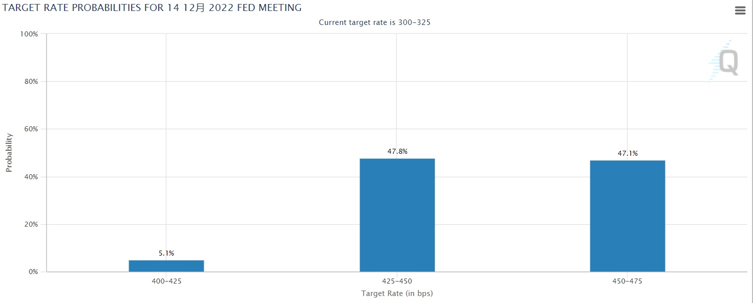 75个基点加息幅度,新闻发布会上鲍威尔维持鹰派立场。摩根大通表示,这是最有可能的结果,“美联储能够保留12月和2023年会议的所有选择权,同时强调当前通胀走高的风险,这是最有可能的结果。”该团队还认为,这是债券市场最期待的结果,因此,债券收益率可能不会出现重大变化,从而股市也避免了暴跌趋势。该行预计届时标普500指数区间为:下跌1%到上涨0.5%。