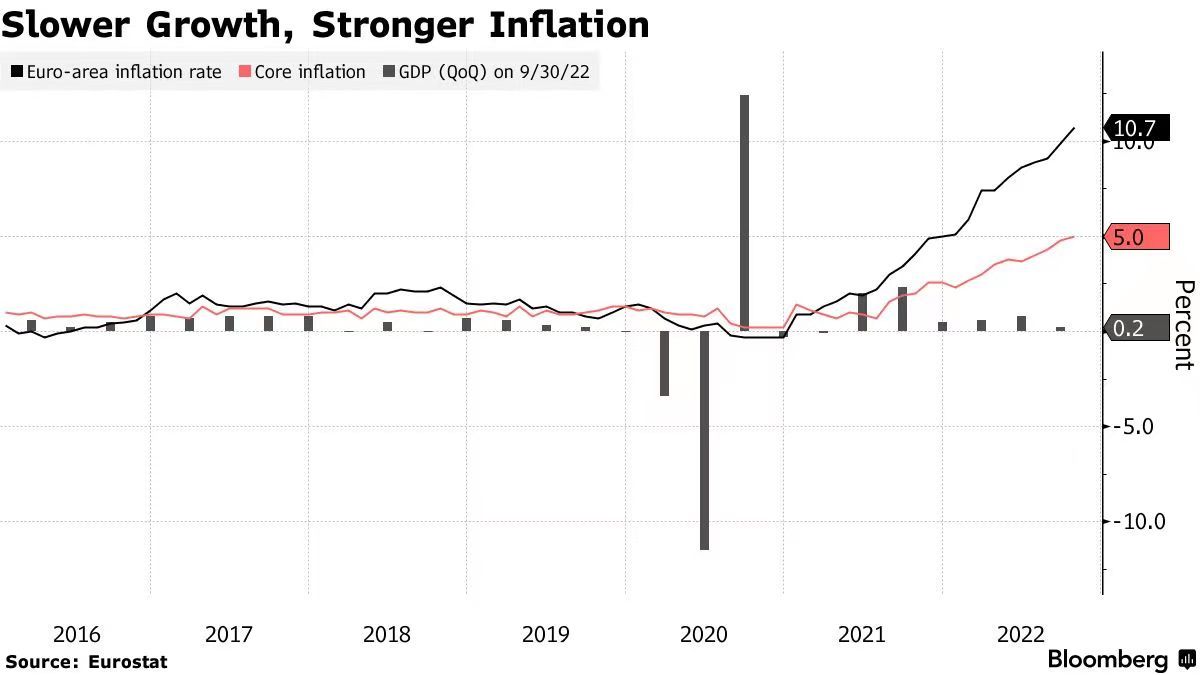 尽管目前欧元区经济增长已经有所放缓,同时许多人预测,由于俄罗斯削减能源供应,衰退可能会在冬季到来,但在10月份,欧元区19个成员国的通胀率仍达到了创纪录的10.7%,超过了分析师的预期。