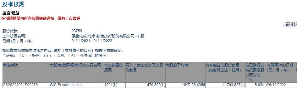 智通财经APP获悉,香港联交所最新资料显示,10月26日,GIC Private Limited减持康龙化成(03759)47.05万股,每股作价28.4356港元,总金额约为1337.89万港元。减持后最新持股数目为1170.3827万股,最新持股比例为5.82%。