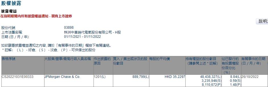 智通财经APP获悉,香港联交所最新资料显示,10月26日,小摩减持时代电气(03898)88.9799万股,每股作价35.2297港元,总金额约为3134.74万港元。减持后最新持股数目约为4843.83万股,最新持股比例为8.84%。