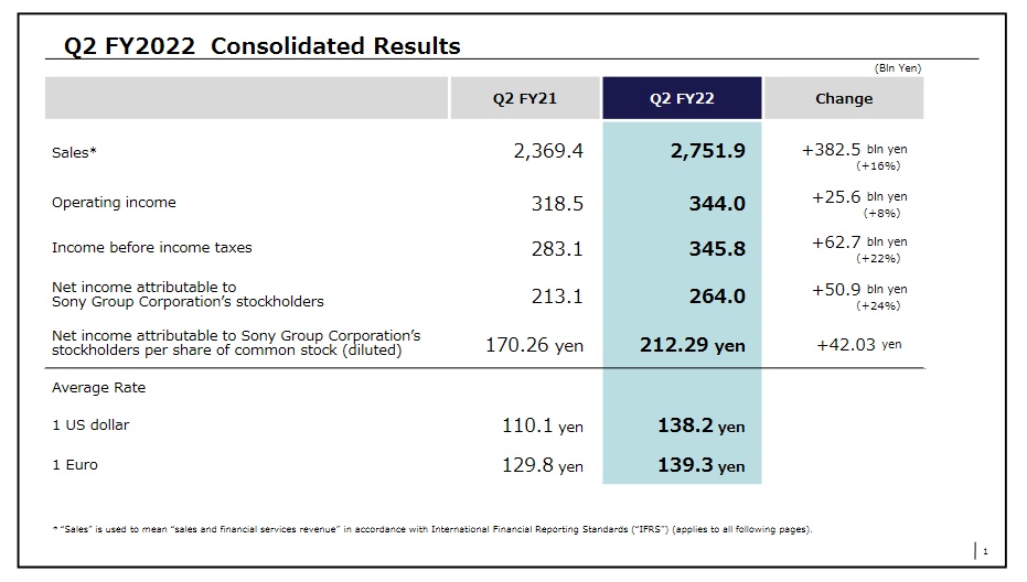 智通财经APP获悉,11月1日,索尼(SONY.US)公布了2022财年第二财季财务业绩。财报显示,该公司Q2销售额为2.75万亿日元,同比增长16%;营业利润为3440亿日元,同比增长8%,好于分析师普遍预期的2807亿日元;归属于公司股东的净利润为2640亿日元,同比增长24%;摊薄后每股收益为212.29日元,上年同期为170.26日元。