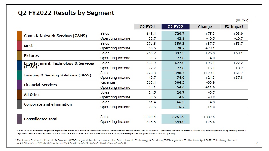 按业务划分,索尼游戏及网络服务业务(G&NS)销售额为7207亿日元,上年同期为6454亿日元;音乐部门销售额为3593亿日元,上年同期为2716亿日元;影视部门销售额为3375亿日元,上年同期为2607亿日元;娱乐、技术及服务业务(ET&S)销售额为6770亿日元,上年同期为5819亿日元;成像与传感解决方案业务(I&SS)销售额为3984亿日元,上年同期为2783亿日元;金融服务销售额为3045亿日元,上年同期为3684亿日元。