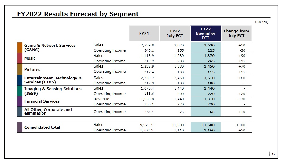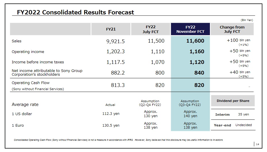 展望未来,索尼将2022财年全年销售额预期由此前的11.5万亿日元上调至11.6万亿日元;将营业利润预期由此前的1.11万亿日元上调至1.16万亿日元,符合分析师预期。
