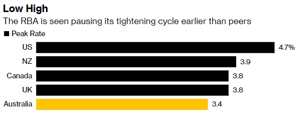 彭博经济学家James McIntyre称:“澳洲联储对经济增长放缓、失业率上升和中期通胀从容的预测表明,加息周期已接近尾声。我们认为澳洲联储将在12月进行最后一次加息,然后在需求恶化和通胀见顶时停止加息。”