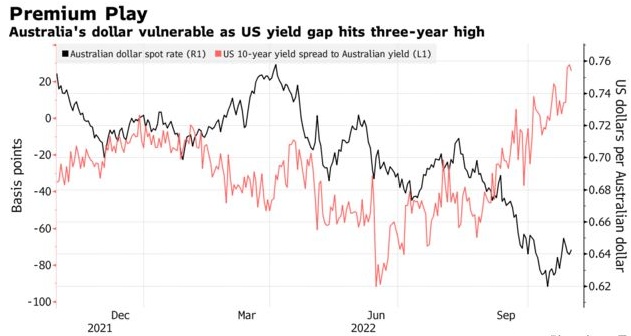 澳洲联储连续第二次加息25个基点,与美联储和英国央行形成鲜明对比,市场预计英美央行本周将加息75个基点。这种差异导致美国与澳大利亚10年期国债收益率存在相当大的利差。本周早些时候,美国10年期国债收益率较10年期澳大利亚国债收益率的差距上升至29个基点,这是自2020年3月以来的最大溢价。