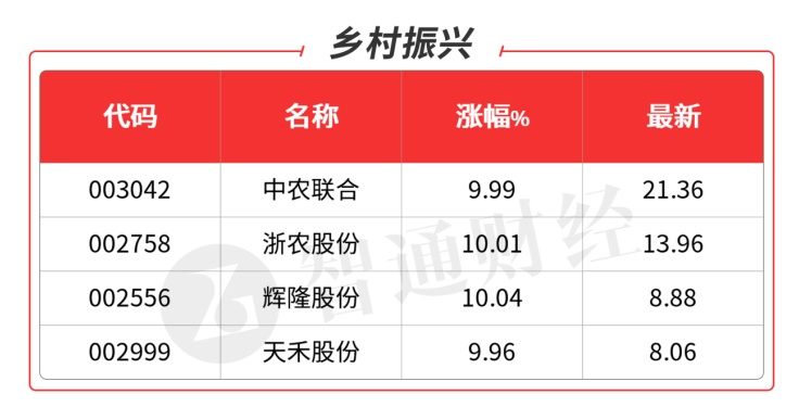 新题材是乡村振兴的供销社概念,作为三农三产融合发展的纽带,是现代商业流通的基础设施。实现农村消费升级。领先的是中农联合(003042.SZ)和天鹅股份(603029.SH),预计明天决出强度。其它有浙农股份(002758.SZ)及辉隆股份(002556.SZ)。板块容量偏小,观察持续性如何。