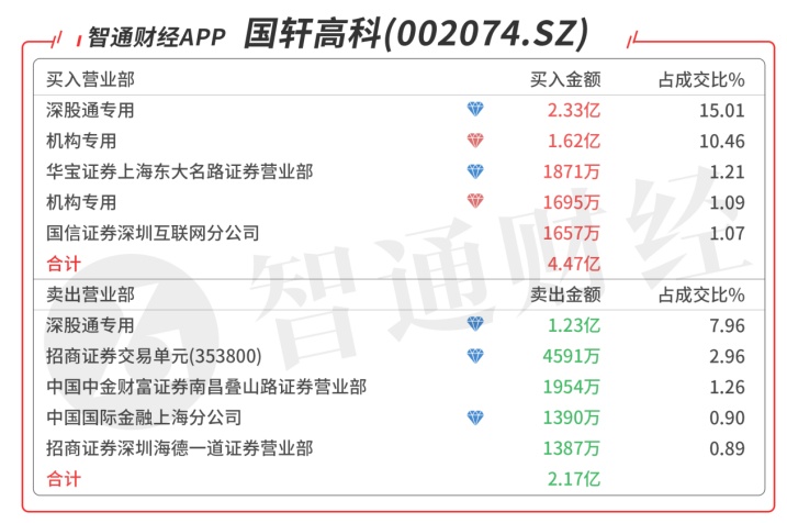 国轩高科(002074.SZ):龙虎榜阵容豪华,机构席位买入1.79亿元,深股通大单对倒净买入1.09亿元,买三是知名游资的席位买入1679万元,当日净买入2.52亿元,预计压力位在60日线附近,突破需放量。