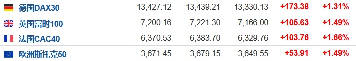 2. 截至发稿,德国DAX指数涨1.31%,英国富时100指数涨1.49%,法国CAC40指数涨1.66%,欧洲斯托克50指数涨1.49%。
