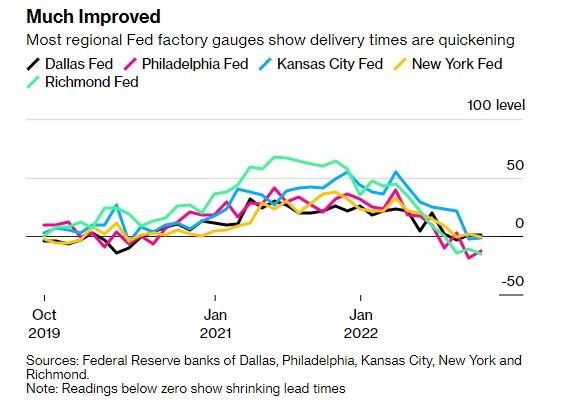 交货时间整体改善的一个关键原因是:需求走软有助于疏通曾经塞满原材料、零部件和成品的运输管道。