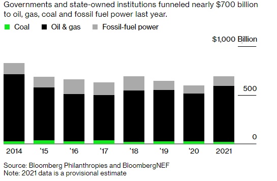 彭博新能源财经分析师Victoria Cuming和Maia Godemer在报告中写道,来自政府和国有机构的资金扭曲了价格,鼓励了化石燃料的无节制使用和生产,并推动了对寿命长、排放密集型设备和基础设施的投资。