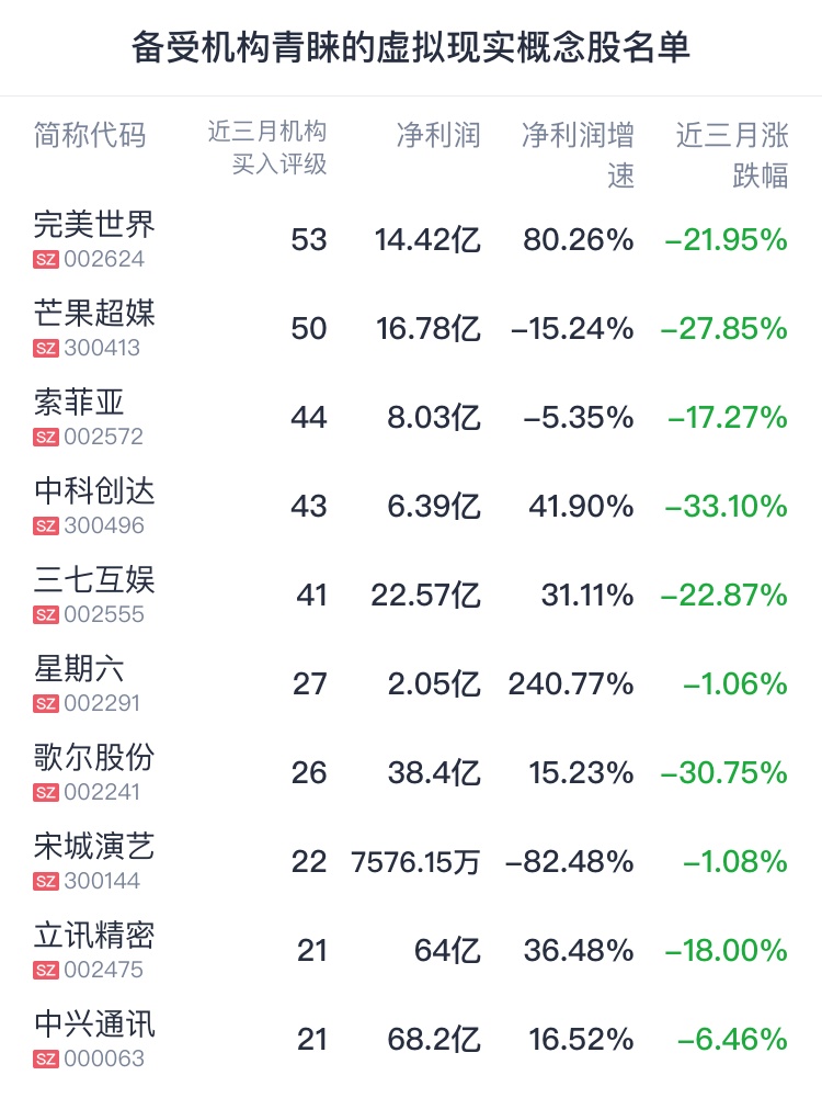 腾讯自选股为您梳理了,备受机构青睐的虚拟现实概念股名单,供您参考。其中,完美世界、芒果超媒最近三个月均获超50家机构给出“买入”评级。