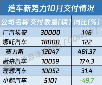 4、10月车企成绩单:赛力斯同比增461.37% 小鹏交付腰斩