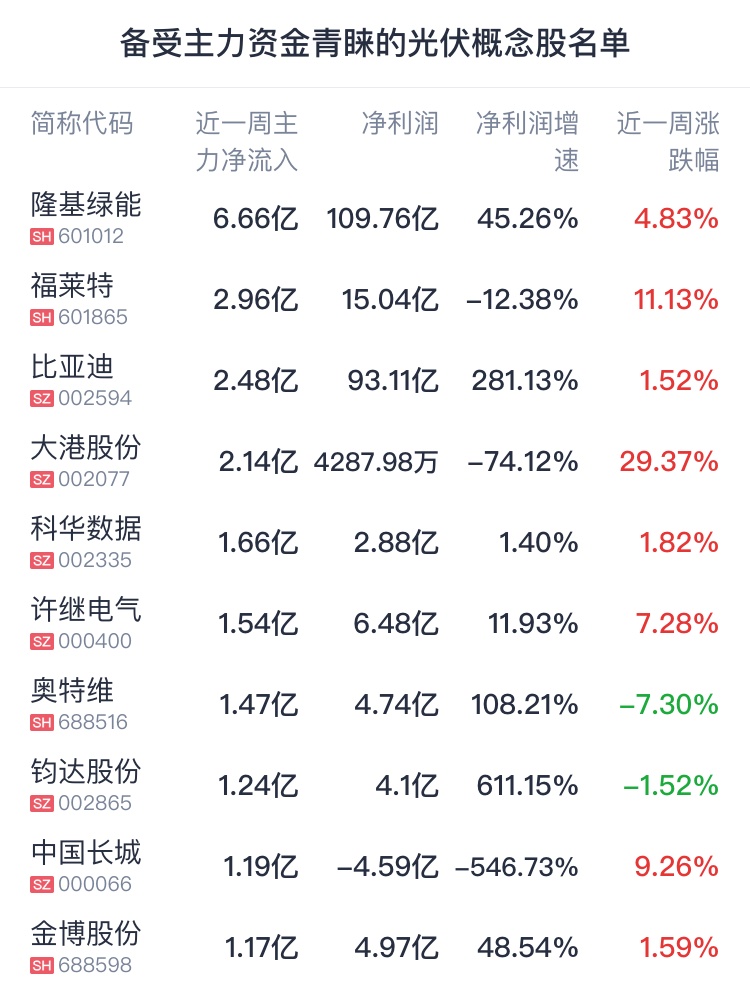 腾讯自选股为您梳理了,备受主力资金青睐的光伏概念股名单,供您参考。其中,隆基绿能最近一周获主力资金净流入达6.66亿元;此外,福莱特、比亚迪、大港股份等股亦备受主力资金青睐。