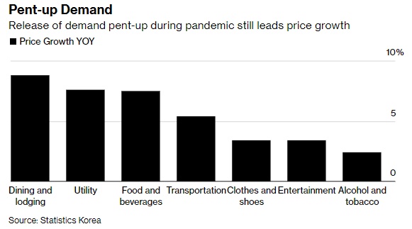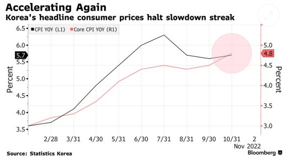 智通财经APP获悉,韩国10月份通货膨胀率再次上升,韩国统计局周三公布的数据显示,消费者价格指数(cpi)较上年同期上涨5.7%,高于9月份的5.6%,符合经济学家的预期。核心通货膨胀加速至4.8%,远高于预期的4.5%。