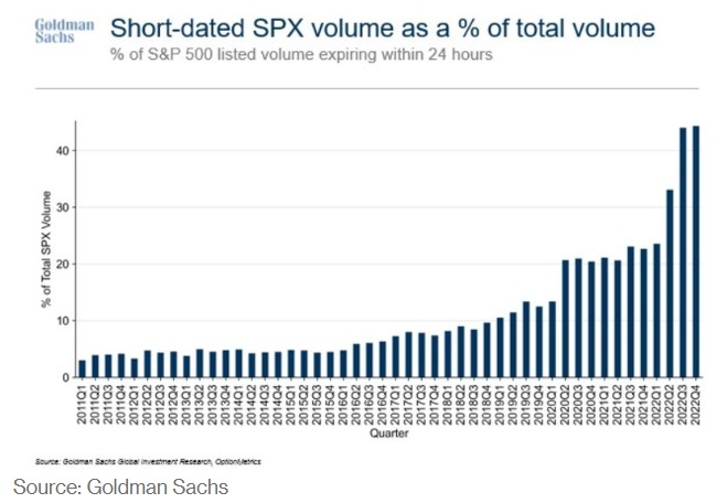 这一风险策略曾经是短线交易员在meme股票上寻求快速获利的热门玩法,而如今似乎在散户和机构投资者中变得更受欢迎。根据高盛汇编的数据显示,在第三季度,一天内到期的标普500指数期权占总交易量的40%以上,几乎是六个月前的两倍。