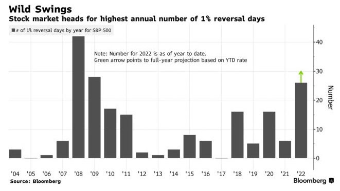 周二是标普500指数在2022年第26次在单个交易日内抹去至少1%的涨幅或跌幅。自2008年金融危机以来,市场从未经历过如此频繁的波动。震荡的市场滋生了对冲活动和投机行为。芝加哥期权交易所等公司将期权到期时间延长到每个工作日的举措也助长了股市的繁荣。