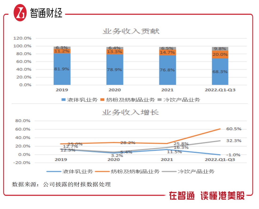 该公司主要业务包括液体乳业务、奶粉及奶制品业务及冷饮产品,过去三年三大业务收入复合增速分别为7.29%、26.96%及12.77%。奶粉及奶制品业务增速较快,收入份额也连年增长,今年首三季,该业务收入增速高达60.5%,收入份额提升至20%,而核心的液体乳业务收入下滑1%,收入份额下降至68.3%。