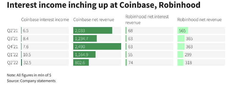 根据Refinitiv的IBES数据,分析师预计Robinhood的净利息收入将激增65%,而Coinbase的订阅和服务收入(包括利息收入)预计将增长28%。