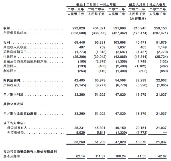 于2019年、2020年及2021年12月31日止年度以及截至2022年6月30日止六个月,公司收益分别约为2.930亿元、4.343亿元、5.311亿元及2.592亿元人民币。同期,毛利分别约为6944.6万元、9533.1万元、1.037亿元及5167.9万元人民币。