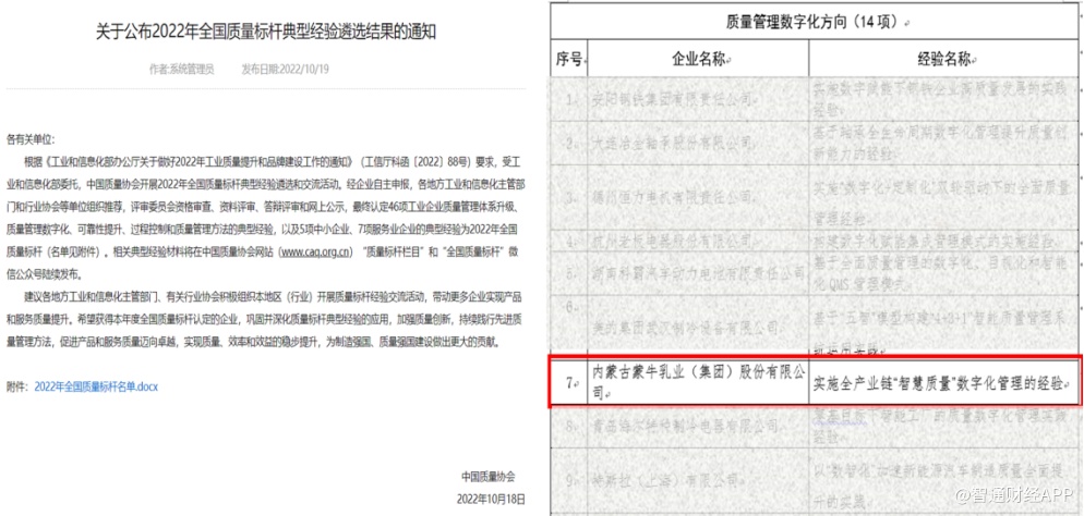 此外,中国质量协会于近期正式发布“2022年全国质量标杆”,蒙牛凭借全产业链“智慧质量”数字化管理的不懈探索和实践,在34个入围项目中脱颖而出,最终斩获“2022年全国质量标杆”,是乳业行业唯一获奖企业。