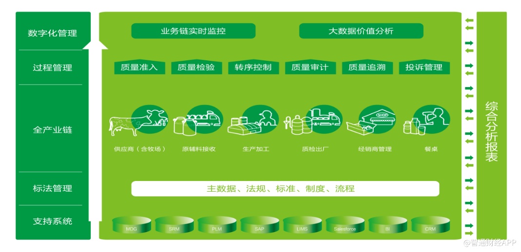 早在2002年,蒙牛就开始了质量信息化布局方面的探索,先后启动并升级数字化战略,开展蒙牛“智慧质量”建设。通过在“智慧质量”方面的深入布局,蒙牛搭建了覆盖“养殖—研发—采购—生产—储运—销售—终端”的全链路信息平台,打通了从牧场到餐桌的全流程质量管理。