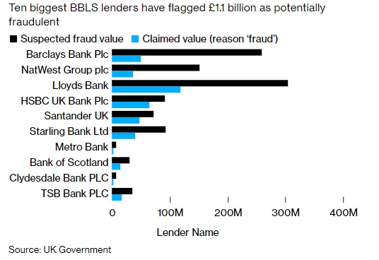 去年3月,英国商业、能源和工业战略部估计,在BBLS计划下发放的所有贷款中,11%(价值49亿英镑)可能是欺诈性的。由于还款仍在陆续到期,尚不确定总损失金额。