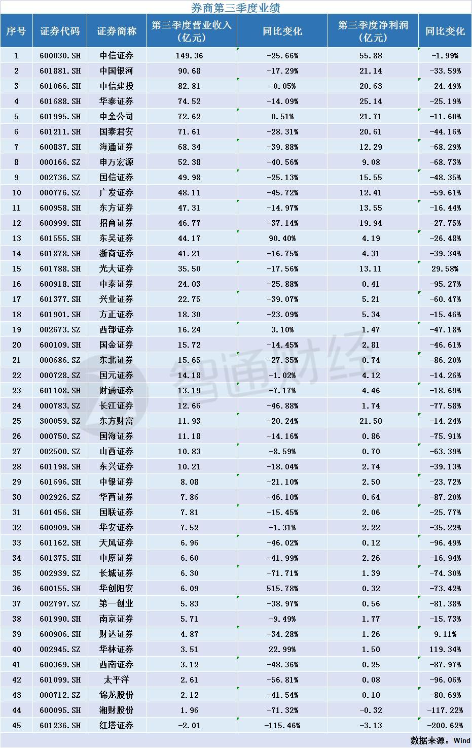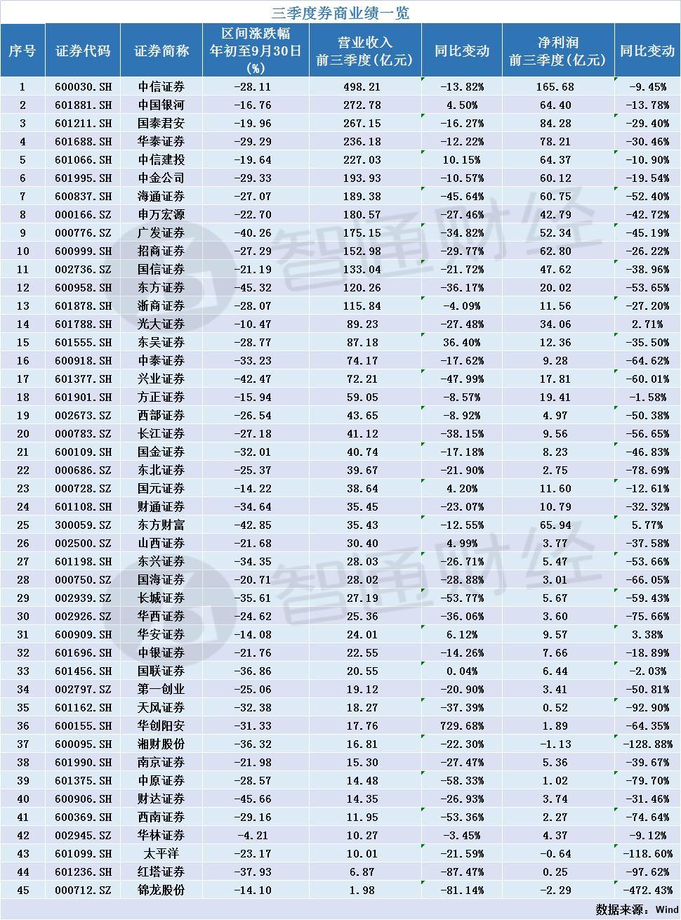 业绩方面,45家券商中,35家券商营收、净利双降,13家券商前三季度营收超百亿,42家券商净利润为正,仅太平洋证、湘财股份、锦龙股份3家亏损。中信证券实现归母净利润165.68亿元,成为市场唯一一家利润过百亿的券商。